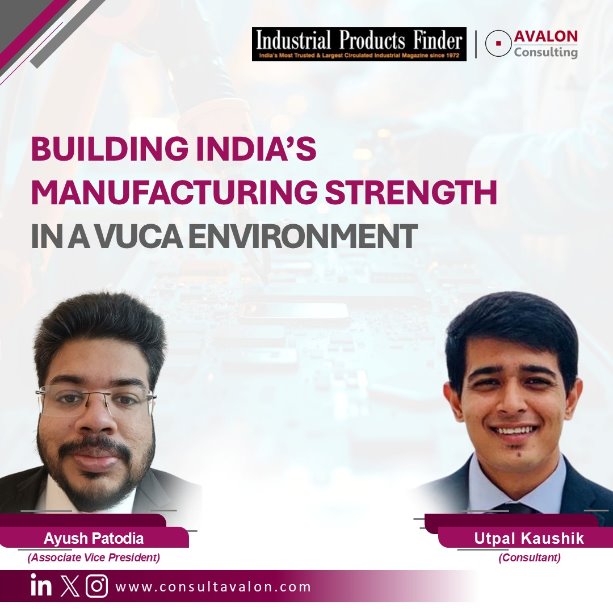 Ayush Patodia, Associate Vice President, and Utpal Kaushik, Consultant at Avalon Consulting, co-authored their views on “Building India’s Manufacturing Strength in a VUCA Environment”, which was published in Industrial Products Finder.